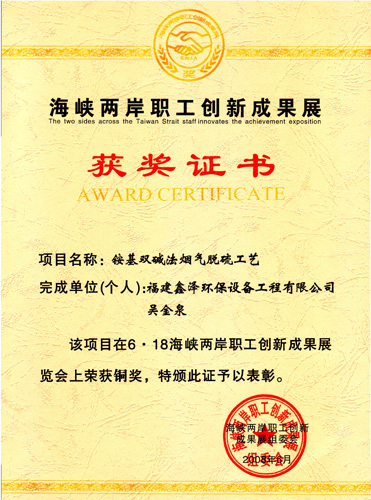 海峡两岸职工创新成果展铜奖(铵基双碱法烟气脱硫工艺)