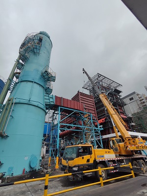 目前脱硫的脱硫塔已封顶,塔内主要设备喷淋层等安装完毕,外围管道的冲洗水、循环管道等安装中,正在逐步完善。脱硫塔内部防腐塔体已完成大部分,剩余底板和塔体进口段暂时无作业面。除尘主体正在进行中,脱硝部分也在有条不紊的进行中。