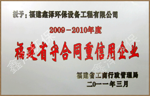 2011年3月21日,福建省工商行政管理局发布了一份《关于授予“2009—2010年度福建省守合同重信用企业”的公告》,鑫泽环保位居前列。 “福建省守合同重信用企业”两年评选一次,由省工商局严格把关,评选过程除了需查询全省工商系统行政执法记录、确定参评单位无不诚信记录外,还需征求省、市文明办、经贸、质监、建设、税务、银行、海关等有关部门意见,并组织工作人员赴企业进行现场考察,包括审查企业签订的合同文本及其管理机制等。公司一向秉持诚信经营理念,未来也将继续坚持,为推进我省社会管理创新、社会信用体系建设做贡献。