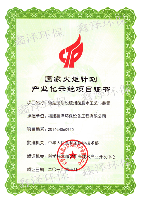 据国家科技部“关于下达2014年度国家科技计划项目的通知”,福建鑫泽环保设备工程有限公司自主研发的“新型湿法脱硫烟囱脱水工艺与装置”,获得“国家火炬计划项目(产业化示范项目)”立项。说明该项目产品的技术性能和市场前景得到了充分认可,其产业化方向得到了国家政策的鼓励和大力支持。同时,也表明公司在湿法脱硫技术研发领域具有较强的领先优势,这标志着鑫泽环保自主创新能力和核心竞争力的又一重要提升。
