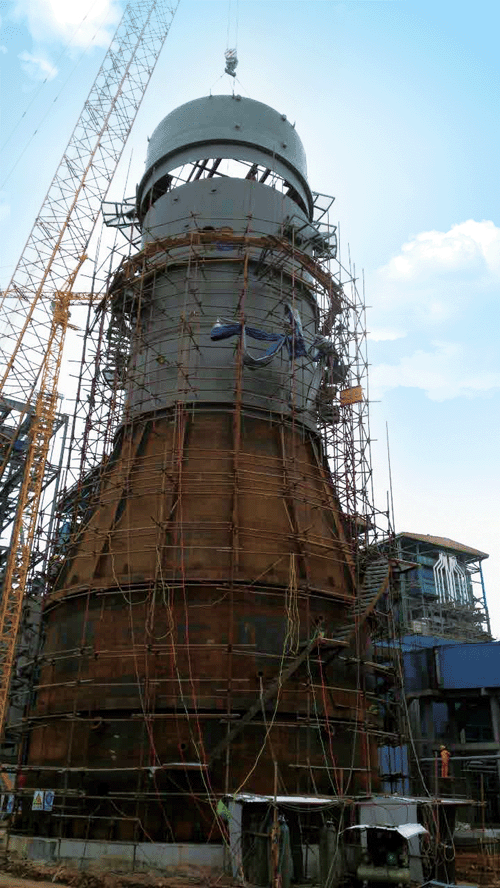 湛江晨鸣浆纸有限公司电厂扩建工程400t/h锅炉烟气脱硫、脱硝、湿电工程由我公司承建,塔体基础于12月5日交付,脱硫吸收塔、湿式电除尘、直排烟囱合一塔正式开始安装。为缩短施工工期、加快工程进度,前期已对塔体进行了预制施工,正式安装十分顺利。目前合一塔已安装至喷淋段。在确保安全和质量的前提下,项目部正在加快进度,争取早日安装至湿电段并移交内防腐和湿电内件吊装。